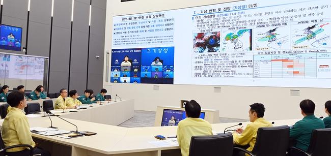김광용 행정안전부 재난안전관리본부장이 25일 정부세종청사 중앙재난안전상황실에서 호우 대비 상황 점검회의를 주재하고, 25일 밤부터 26일 새벽까지 취약시간대 호우 상황을 고려해 각 기관에 철저한 사전 대비를 요청하고 있다.
