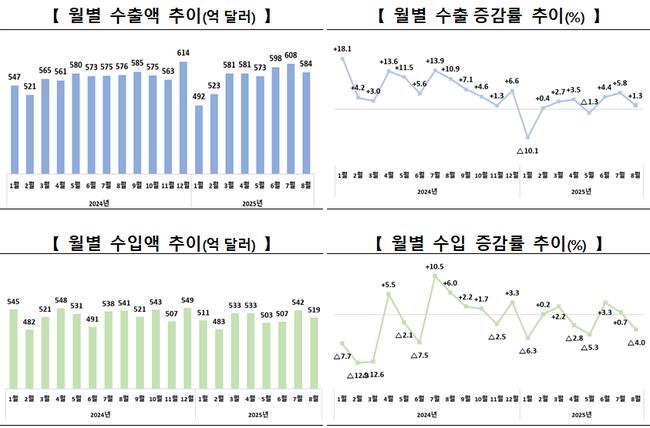 산업통상자원부에 따르면 8월 수출은 전년 동월 대비 1.3% 증가한 584억 달러, 수입은 4.0% 감소한 518억 9천만 달러를 기록했다. 조업일수가 하루 줄었음에도 일평균 수출은 26억 달러로 5.8% 늘었다.