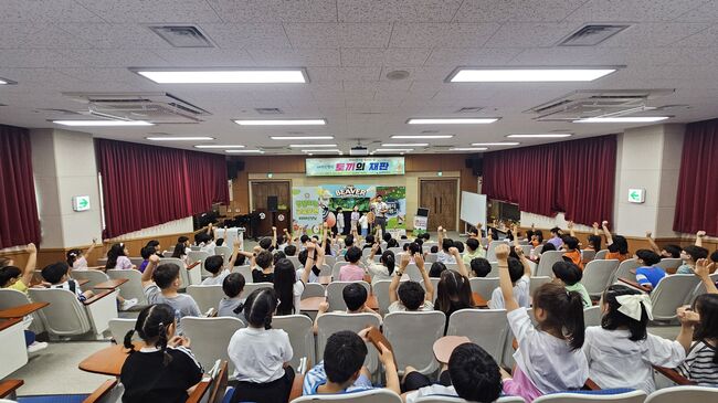 석적초등학교(교장 배학섭)는 9월 3일 2교시에 1학년 119명의 학생을 대상으로 경상북도교육청 칠곡도서관 주관 2025년 찾아가는 매직인형극 「토끼의 재판」을 관람했다고 4일 밝혔다.