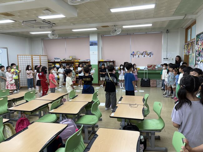 리오바 어린이집 유아들이 정평초등학교 1학년 교실에서 학생들과 함께 어울리며 학교생활을 체험하는 정평초등학교(교장 박현주)는 2025년 9월 10일(수) 유–초 연계 교육의 일환으로 대구시 수성구 소재 수성대학교 리오바 어린이집 6세반 2개 학급(총 39명)의 어린이들을 초청해 10시 30분부터 12시까지 교내 시설 견학과 체험 활동을 실시하였다.