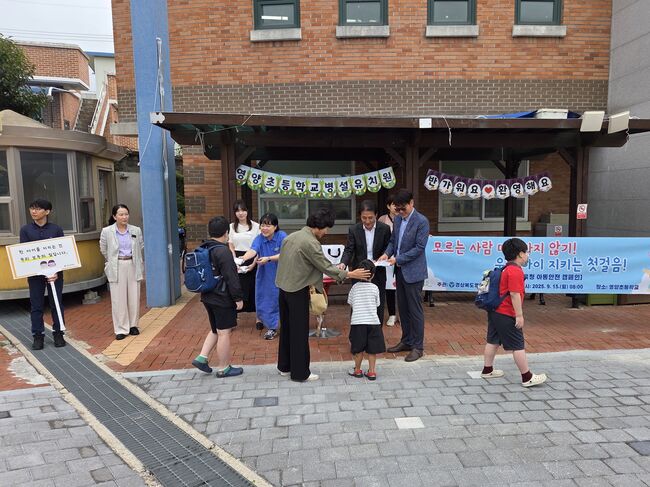 영양교육지원청 관계자들이 영양초등학교 후문 앞에서 학생들의 안전한 등굣길 조성을 위해 피켓과 현수막을 들고 캠페인을 펼치고 있다.경상북도영양교육지원청(교육장 박근호)은 9월 15일(월) 오전 8시, 영양초등학교 후문 앞에서 학생들이 안심하고 등교할 수 있는 환경 조성을 위한 「등굣길 안심 캠페인」을 실시했다.