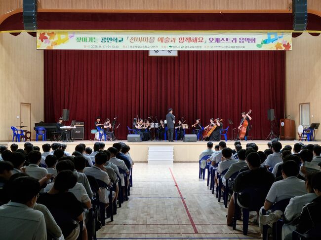 영주제일고등학교 강당에서 열린 ‘찾아가는 오케스트라 공연’에서 학생들이 오케스트라 연주를 감상하고 있다.영주제일고등학교(교장 최강호)는 9월 17일 본교 강당에서 ‘찾아가는 오케스트라 공연’을 개최하였다. 이번 공연은 학생들에게 수준 높은 공연을 제공하여 예술적 감수성과 창의력을 함양하고, 문화예술 향유의 기회를 확대하기 위해 마련되었다.