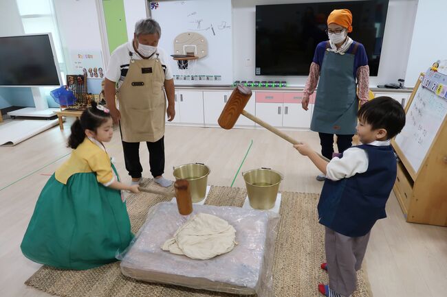 아이들은 투호놀이, 제기차기, 윷놀이 등 다양한 전통놀이를 즐기며 협동과 배려의 의미를 체험했다. 이어진 떡메치기 시간에는 “하나, 둘!” 구호를 외치며 힘을 모아 떡을 치는 즐거운 시간을 가졌고, 완성된 인절미를 나누며 전통음식의 따뜻한 맛을 함께 느꼈다.