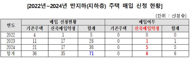 국회 국토교통위원회 소속 송기헌 의원(더불어민주당·강원 원주을·3선)이 한국토지주택공사(LH)로부터 제출받은 자료에 따르면, 2022년부터 2024년까지 3년간 접수된 반지하(지하층) 주택 매입 신청은 총 71건(735세대)에 달했지만, 실제 매입이 완료된 건수는 6건(135세대)에 불과했다. 매입률은 8.45%로, 대부분의 신청이 반려된 셈이다.