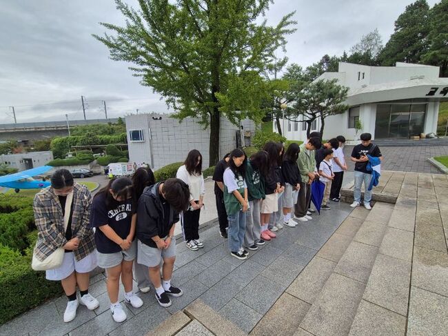 왜관중학교 학생들이 칠곡 전적기념관 앞에서 전쟁 희생자들을 추모하며 묵념하고 있다.