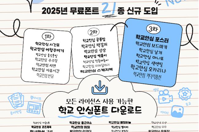 교육부와 한국교육학술정보원은 학교 현장에서 저작권 부담 없이 자유롭게 사용할 수 있는 ‘학교 안심폰트’ 21서체 21종을 새로 보급한다고 밝혔다. 이번 추가 보급으로 학교 안심폰트는 총 65서체 88종으로 확대돼, 전국 학교에서 교육자료와 안내문을 제작할 때 저작권 걱정 없이 폭넓게 활용할 수 있게 된다.