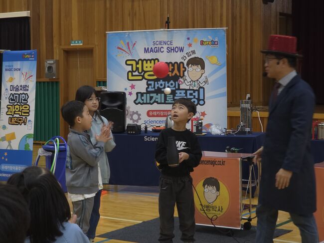 과학 마술쇼에 참여한 학생들이 마술사와 함께 과학 실험의 신비를 체험하고 있다.