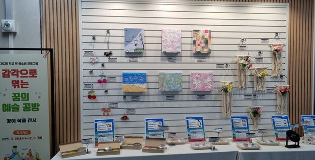 “감각으로 엮은 꿈” … 청소년 창작품 전시 전경 전시 주제는 ‘감각으로 엮는 꿈의 예술 공방’으로, 참여 청소년들이 직접 만든 머그컵, 글라스아트 썬캐쳐, 자개 공예, 백드롭 페인팅, 마크라메, 석고 방향제, 플라워 캔들 등 총 30여 점의 작품이 전시된다.