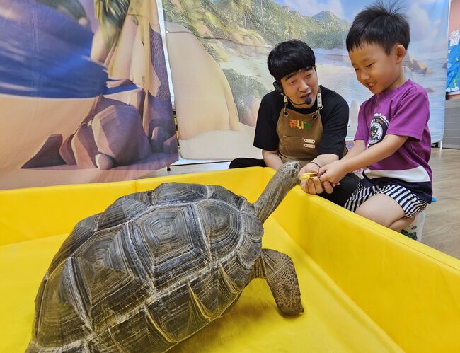 유아가 교사와 함께 큰 거북이에게 먹이를 주며 동물생태체험활동을 하고 있는 모습.칠곡 지천초등학교병설유치원(원장 안덕순)은 2024년 3월부터 현재까지 유·초 이음교육의 일환으로 ‘찾아오는 동물생태체험학습’을 지속적으로 운영하고 있다.
