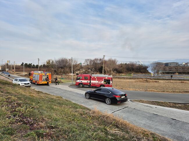 경북 경산시 하양읍 환상리 인근 농지에서 영농 폐기물 소각으로 발생한 연기와 불길. 소방당국이 출동하여 진화 작업을 진행 중이며, 이는 주택 화재 발생 시 소방력 분산이라는 심각한 문제를 야기하고 있다. 도로를 지나가던 독자가 본지 제보에 따라 취재진이 찾은 경산시 하양읍 환상리 인근 농지서는 여전히 위험천만한 '습관적 소각 행위'가 반복되고 있었습니다. 수십 년간 이어온 ‘농사 관행’이라는 이유로, 주로 고령의 농민들이 영농 폐기물이나 논두렁을 태우는 행위를 하면서 소방차가 주기적으로 출동하는 상황입니다.