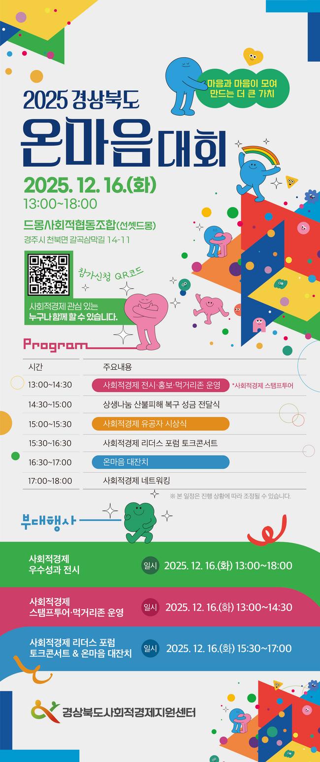 한편, 이번 행사는 경상북도가 주최하고 경상북도사회적경제지원센터가 주관하며, 사전 참가 신청은 포스터 내 QR코드를 통해 가능하다.