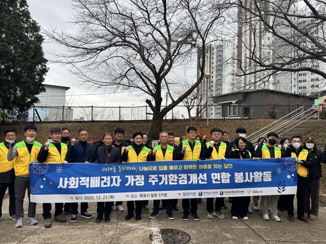 전라남도교육청 소속 교직원과 중증장애인복지협회, 전남미래교육연구소, 목포교육지원청 및 관내 초등학교 회원들은 23일, 지역 내 취약계층 가정 3곳을 찾아 주거환경 개선을 중심으로 한 연합 봉사활동을 진행했다.