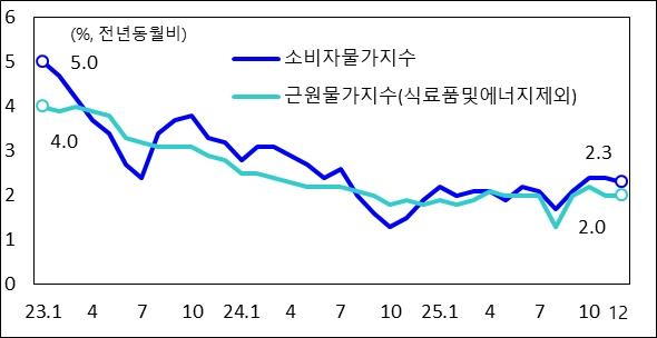 정부는 12월 소비자물가가 농산물 출하량 확대와 축산물 도축량 증가로 농축수산물 가격 상승폭이 줄어 전년 동월 대비 2.3% 올랐고, 식료품·에너지를 제외한 근원물가는 2.0% 상승했다고 밝혔다.