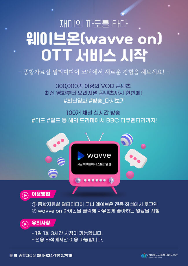 경상북도교육청 의성도서관(관장 이미경)은 오는 13일(화)부터 이용자가 필요로 하는 다양한 영상 콘텐츠를 실시간으로 제공하는 ‘웨이브온 VOD(Video On Demand)’ 서비스를 운영한다고 밝혔다.