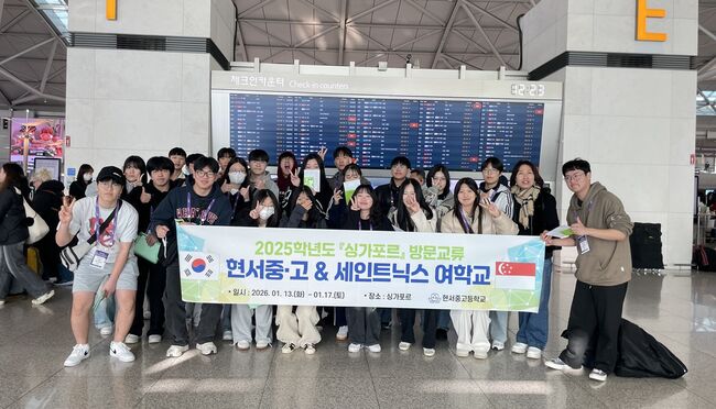 현서중·고등학교 학생들이 2026년 1월 13일(화), 싱가포르 국제 방문교류를 위해 인천국제공항에서 출국에 앞서 기념촬영을 하고 있다. 이번 교류에는 중·고등학생 21명이 참여했으며, 수업 및 문화 교류, 기관 견학, 자연·역사 체험 등 다양한 활동을 진행 중이다.