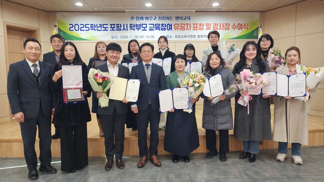 포항교육지원청(교육장 최한용)은 28일 포항교육지원청 중회의실에서 관내 교사와 학부모 15명을 대상으로 ‘2025학년도 학부모 교육참여 활성화 유공자 표창 및 감사장 수여식’을 개최했다.